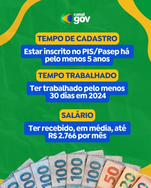 Podem receber o Abono Salarial os trabalhadores do setor privado e do serviço público vinculados a empregadores que contribuem para o PIS/Pasep há pelo menos cinco anos. É necessário ainda ter recebido, em 2024, remuneração média mensal de até R$ 2.766 e exercido atividade remunerada por, no mínimo, 30 dias no ano-base.