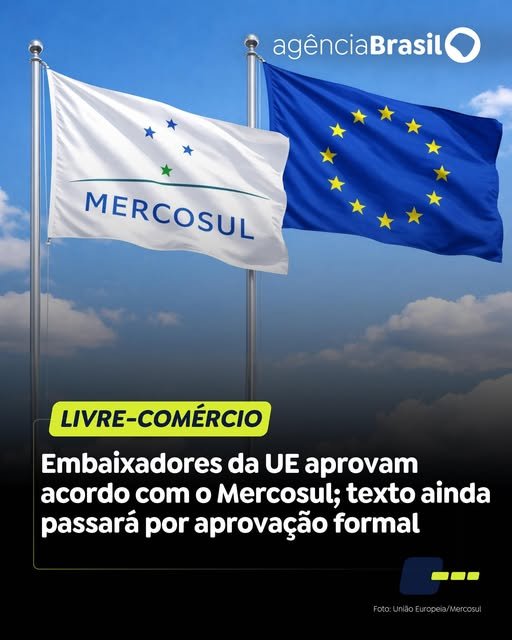 ACORDO COMERCIAL | Os países da União Europeia aprovaram, nesta sexta-feira (9), a assinatura do acordo comercial com o Mercosul, abrindo caminho para o maior tratado de livre-comércio já negociado pelo bloco europeu. A decisão foi tomada em reunião de embaixadores em Bruxelas, apesar da oposição liderada pela França.