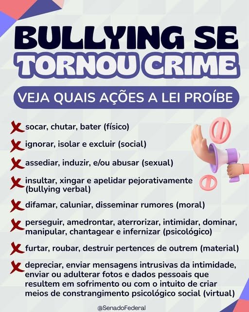BULLYING SE TORNOU CRIME Recentes 30 de setembro de 202529 de setembro de 2025Paulo Jaskowiak ”FONTE: SENADO FEDERAL” A Lei 14.811/2024 incluiu os crimes de bullying e cyberbullying no Código Penal e transforma crimes previstos no Estatuto da Criança e do Adolescente (ECA) em hediondos, como o sequestro e a indução à automutilação.