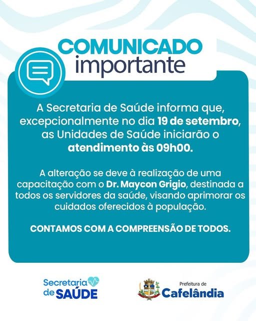 Informamos que, excepcionalmente no dia 19 de setembro, as Unidades de Saúde de Cafelândia iniciarão o atendimento às 09h.