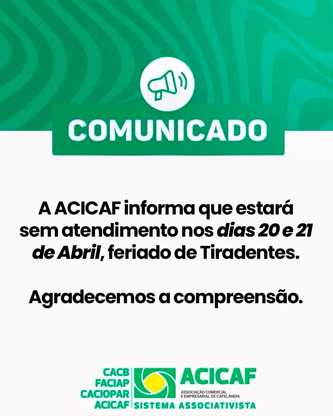 A ACICAF informa que não haverá atendimento nos dias 20 e 21 de abril, em razão do feriado de Tiradentes.