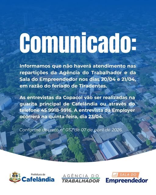 COMUNICADO Recentes 17 de abril de 2026Paulo Jaskowiak Informamos que ao feriado nacional de Tiradentes, entraremos em recesso nos dias:🗓️ Segunda (20/04): Recesso🗓️ Terça (21/04): FeriadoRetornaremos às nossas atividades normais na quarta-feira, dia 22/04.Atenciosamente,Agência do Trabalhador
