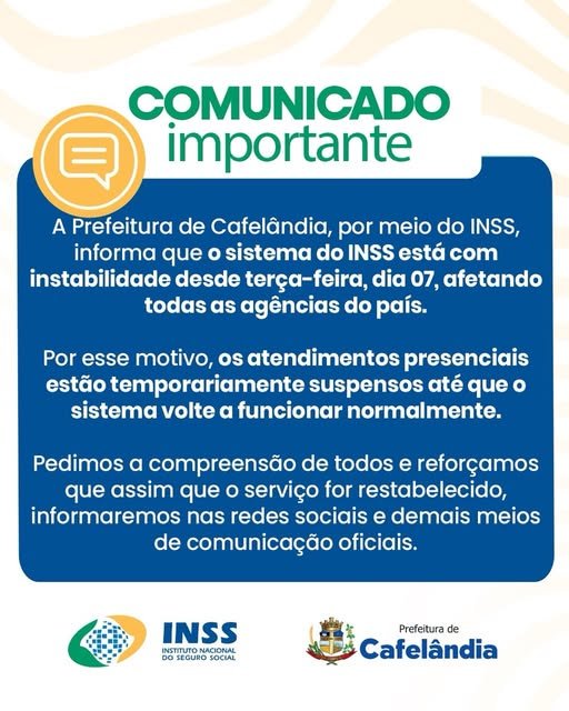 Pedimos a compreensão de todos e informamos que assim que o serviço for restabelecido, divulgaremos nas redes sociais e demais canais oficiais da Prefeitura de Cafelândia