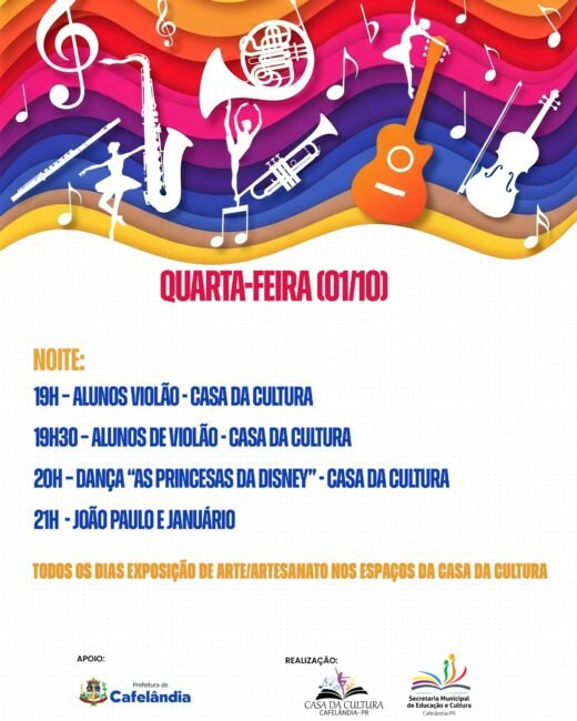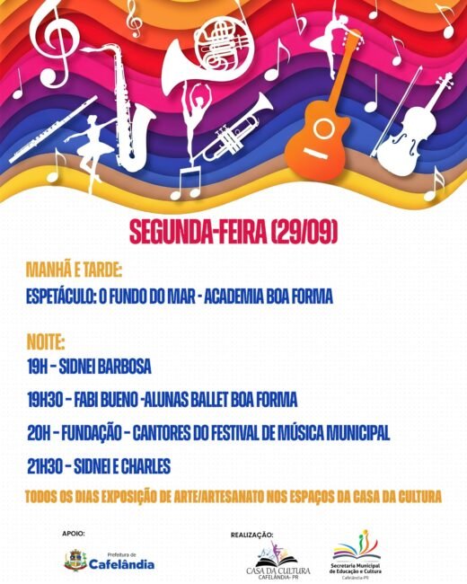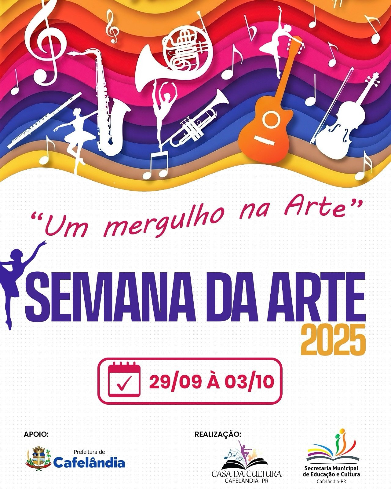 Confira a programação da Semana da Arte, de 29 de setembro a 03 de outubro! Recentes 27 de setembro de 202526 de setembro de 2025Paulo Jaskowiak Confira a programação da Semana da Arte, de 29 de setembro a 03 de outubro!Você é nosso convidado especial para prestigiar os talentos e artistas da nossa cidade.