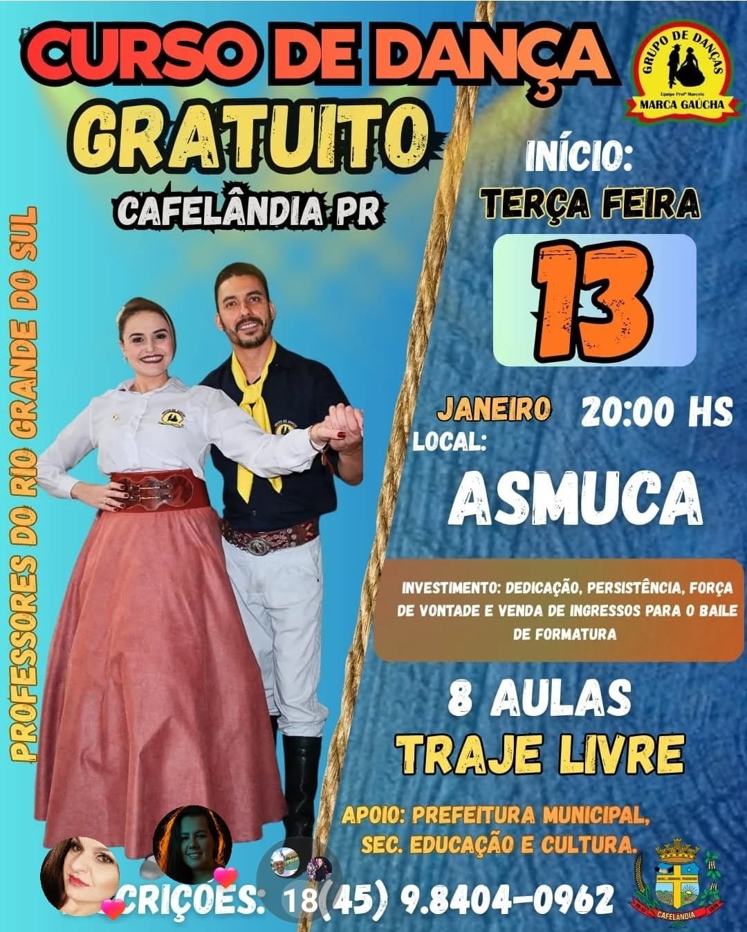 CURSO DE DANÇA Recentes 29 de dezembro de 2025Paulo Jaskowiak CURSO DE DANÇA GRATUITO INÍCIO DIA 13 DE JANEIRO EM CAFELÂNDIA/PARANÁ LOCAL: ASMUCA INSCRIÇÕES: 45-98404-0962