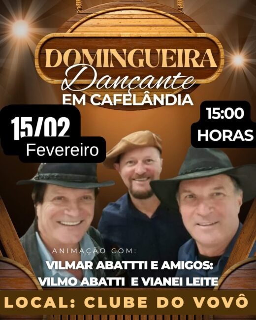 DOMINGUEIRA DANÇANTE EM CAFELÂNDIA Recentes 13 de fevereiro de 202610 de fevereiro de 2026Paulo Jaskowiak DOMINGUEIRA DANÇANTE EM CAFELÂNDIA/PARANÁ DIA 15 DE FEVEREIRO AS 15:00 HORAS LOCAL: CLUBE DO VOVÔ ANIMAÇÃO: VILMAR ABATTTI E AMIGOS: VILMO ABATTI E VIANEI LEITE
