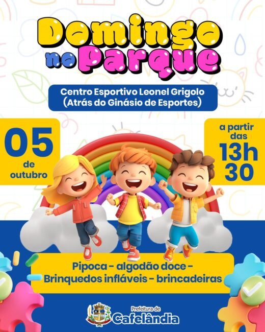 Em alusão ao Dia das Crianças, a Prefeitura de Cafelândia convida todas as famílias para um dia especial de muita diversão no Domingo no Parque! 🌈✨