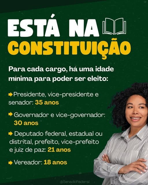 Além da idade mínima, a Constituição Federal também determina como condições para ser eleito a um cargo público. Quer saber mais? Inscreva-se no curso do Senado de Direito Constitucional. O curso é gratuito, pode ser feito de casa e oferece certificado: https://saberes.senado.leg.br/