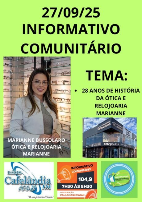 INFORMATIVO COMUNITARIO DIA 27/09/25 SÁBADO. Recentes 26 de setembro de 2025Paulo Jaskowiak INFORMATIVO COMUNITARIO DIA 27 DE SETEMBRO DE 2025 NA RÁDIO CAFELÂNDIA FM 104,9 DAS 7:30 ÀS 8:30, OUÇA PELO RÁDIO OU PELO PLAY.