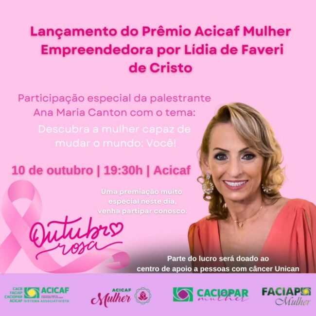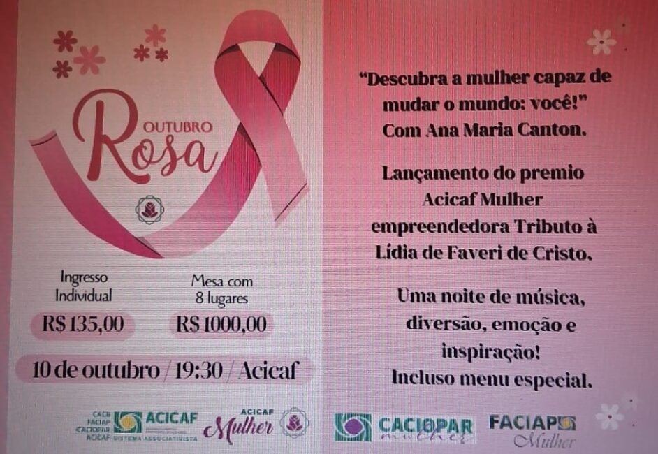 DIVULGAÇÃO DO EVENTO OUTUBRO ROSA, REALIZADO PELA ACICAF MULHER QUE PARTE DOS LUCROS SERÃO DESTINADOS A UNICAM-CASA DE APOIO A PESSOAS COM CÂNCER E SEUS FAMILIARES.