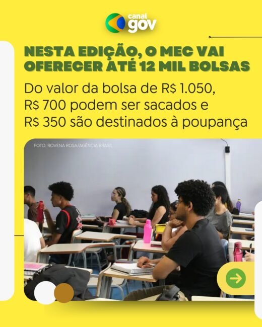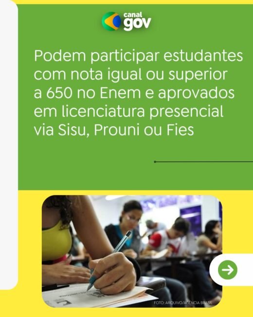Podem participar estudantes com nota mínima de 650 no Enem e aprovados em licenciaturas presenciais via Sistema de Seleção Unificada, Programa Universidade para Todos ou Fundo de Financiamento Estudantil. A bolsa é de R$ 1.050 por mês, sendo R$ 700 para saque imediato e R$ 350 em poupança liberada após ingresso na rede pública de ensino.