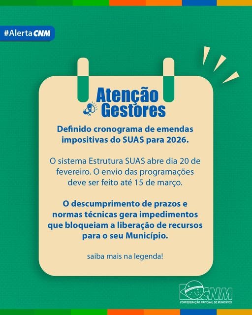 🗓️ Fique atento às datas-chave: 🔹 20/02: Abertura do sistema Estrutura SUAS (antigo SIGTV). 🔹 06/03: Prazo final para parlamentares indicarem as unidades. 🔹 15/03: Prazo para Municípios e Conselhos enviarem as programações. 🔹 18 a 20/05: Registro de impedimentos técnicos no SIOP.