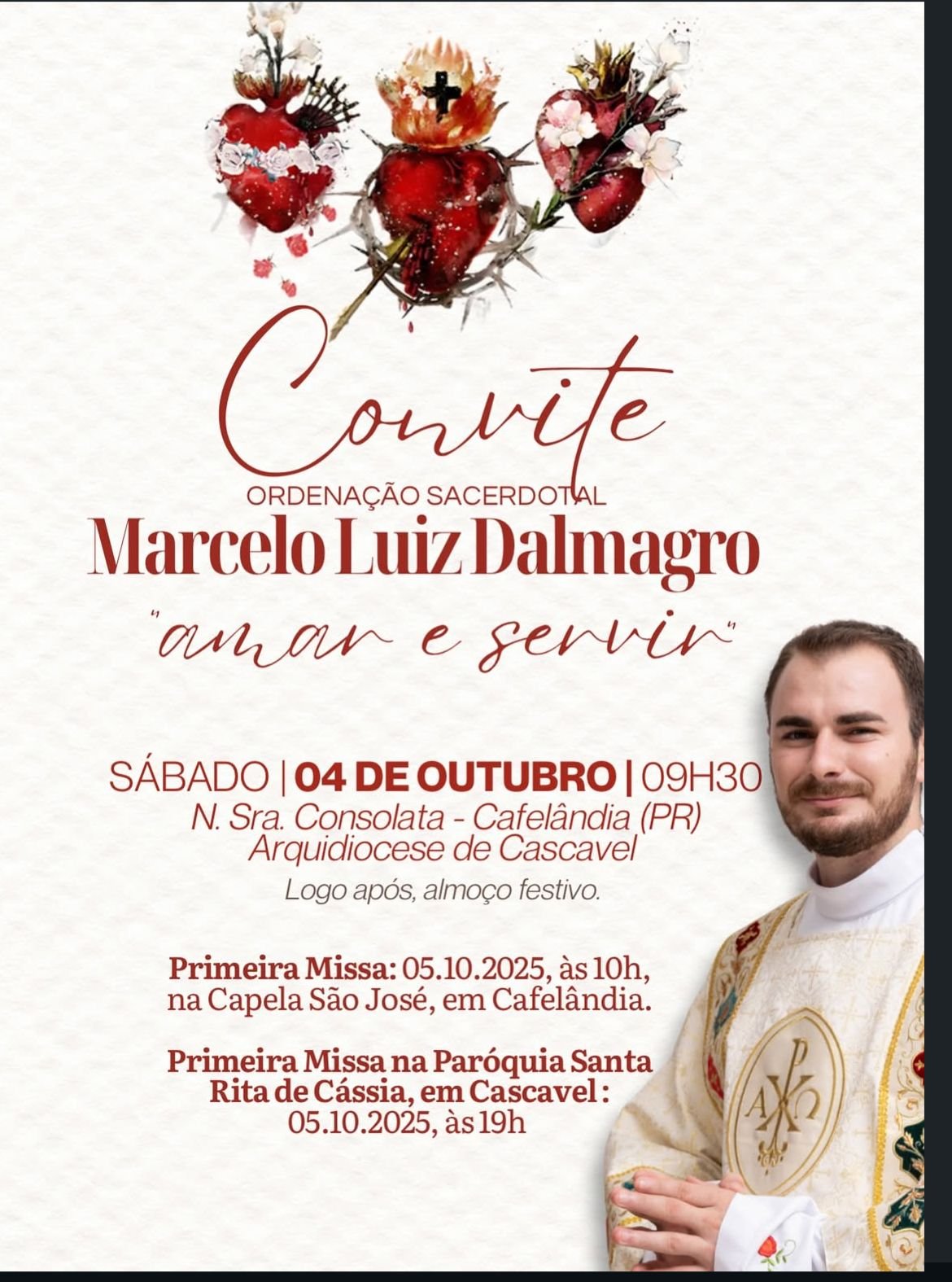 Acontece no próximo sábado, dia 4, às 09:30 hs da manhã na igreja da Matriz Nossa Senhora Consolata em Cafelândia a ordenação Sacerdotal do diácono Marcelo Dalmagro.