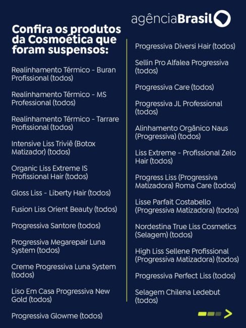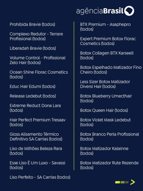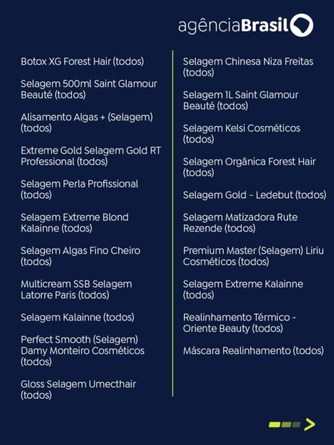 SUSPENSÃO | A Agência Nacional de Vigilância Sanitária (Anvisa) determinou o recolhimento, venda, distribuição, fabricação, propaganda e uso de 69 cosméticos de uso capilar produzidos pela empresa Cosmoética. A Resolução publicada no Diário Oficial da União na segunda-feira (6) estabeleceu as mesmas medidas de suspensão para o produto Truss Máscara Capilar Selante Blond e da Vegan do Brasil Indústria de Cosméticos.