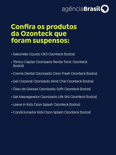 A ação de fiscalização atingiu também a +Briefing Agência de Publicidade e Representações Ltda, responsável pela marca Ozonteck. Oito cosméticos à base de ozônio produzidos pela empresa devem ser recolhidos, e sua comercialização, distribuição, fabricação, propaganda e uso, suspensos. A lista inclui oito linhas de produtos como sabonetes, creme dental, tônico capilar e condicionadores, de uso adulto e infantil.