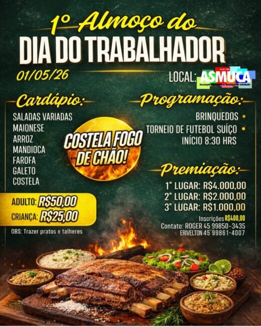 A ASMUCA convida você, sua família e seus colegas de trabalho para participarem do 1º Almoço do Dia do Trabalhador, no dia 01/05/2026, em nossa sede.