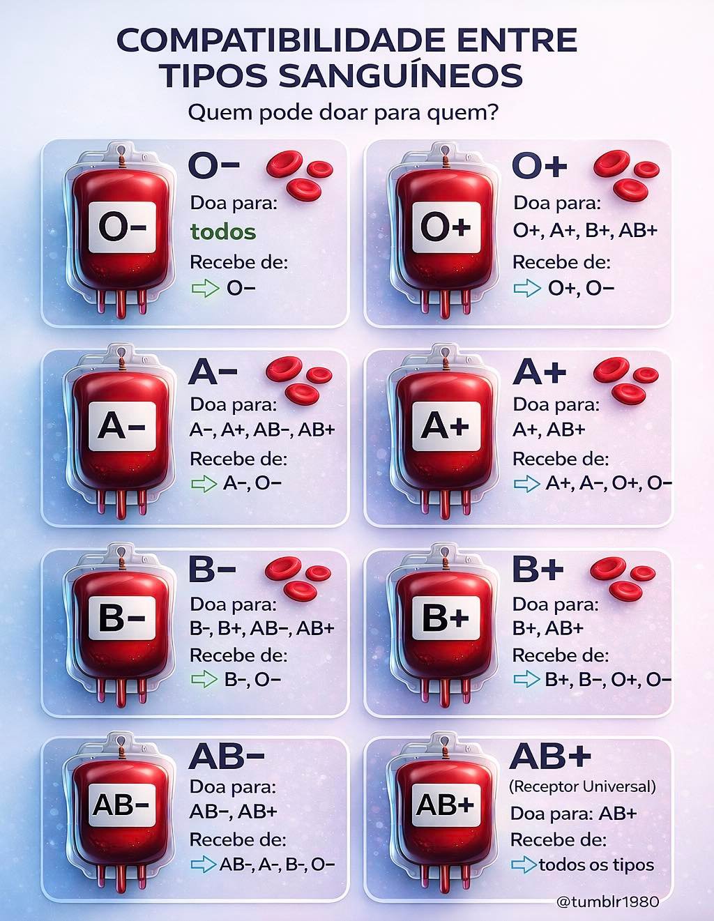 Muita gente não sabe, mas existem 8 tipos sanguíneos diferentes, e cada um possui regras específicas de doação e recebimento.